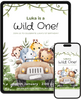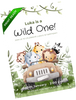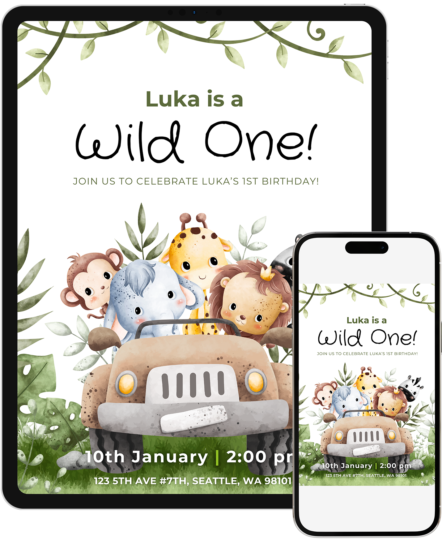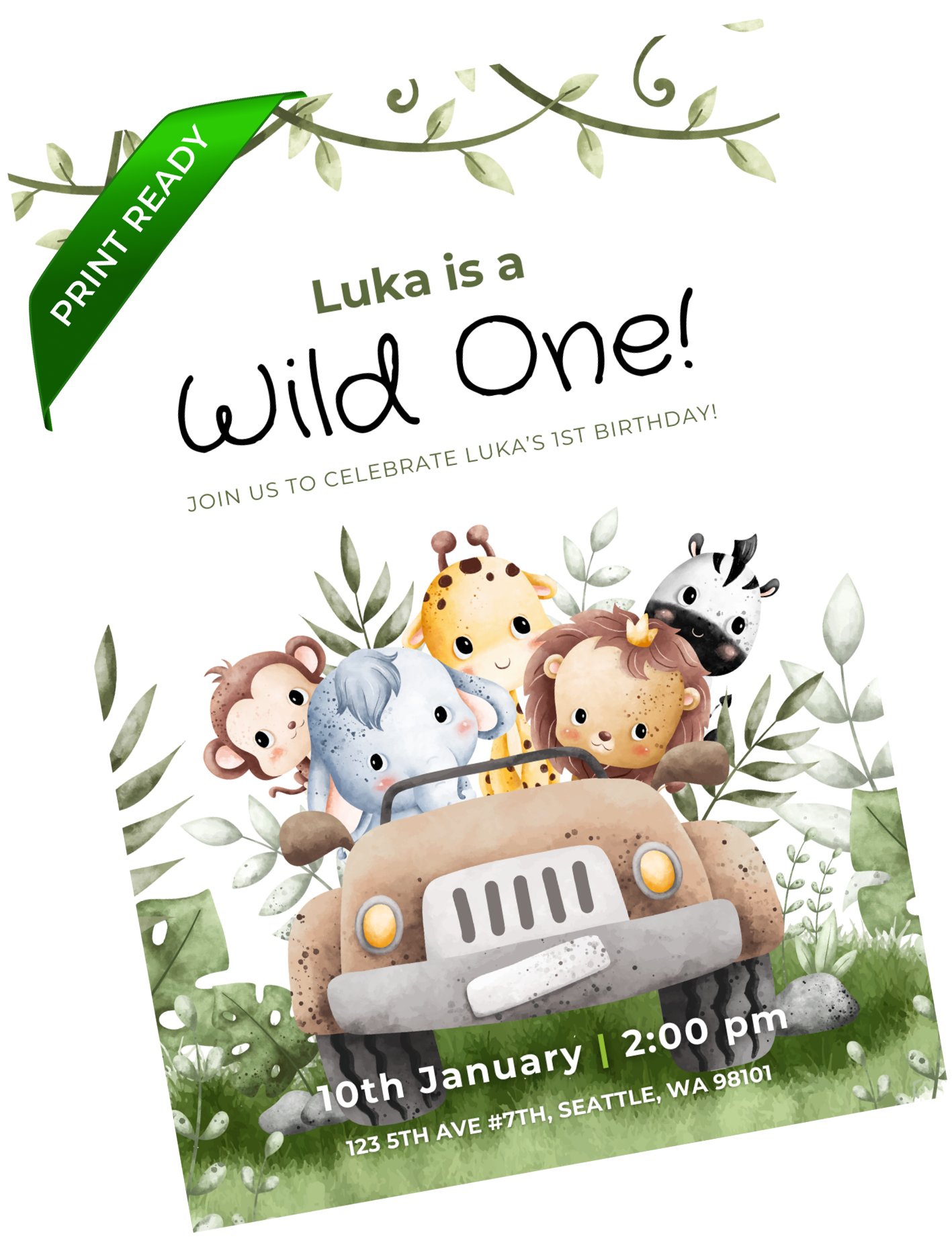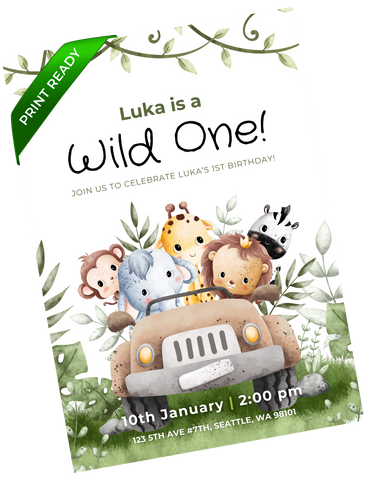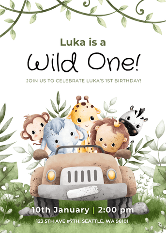 A playful safari birthday design with baby jungle animals riding in a jeep surrounded by greenery. A wonderful match for little explorers who love animals and adventurous first birthday themes. Edit instantly in Canva and print or send digitally.