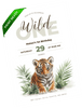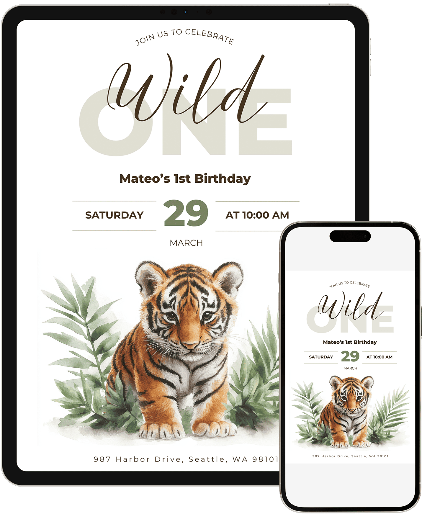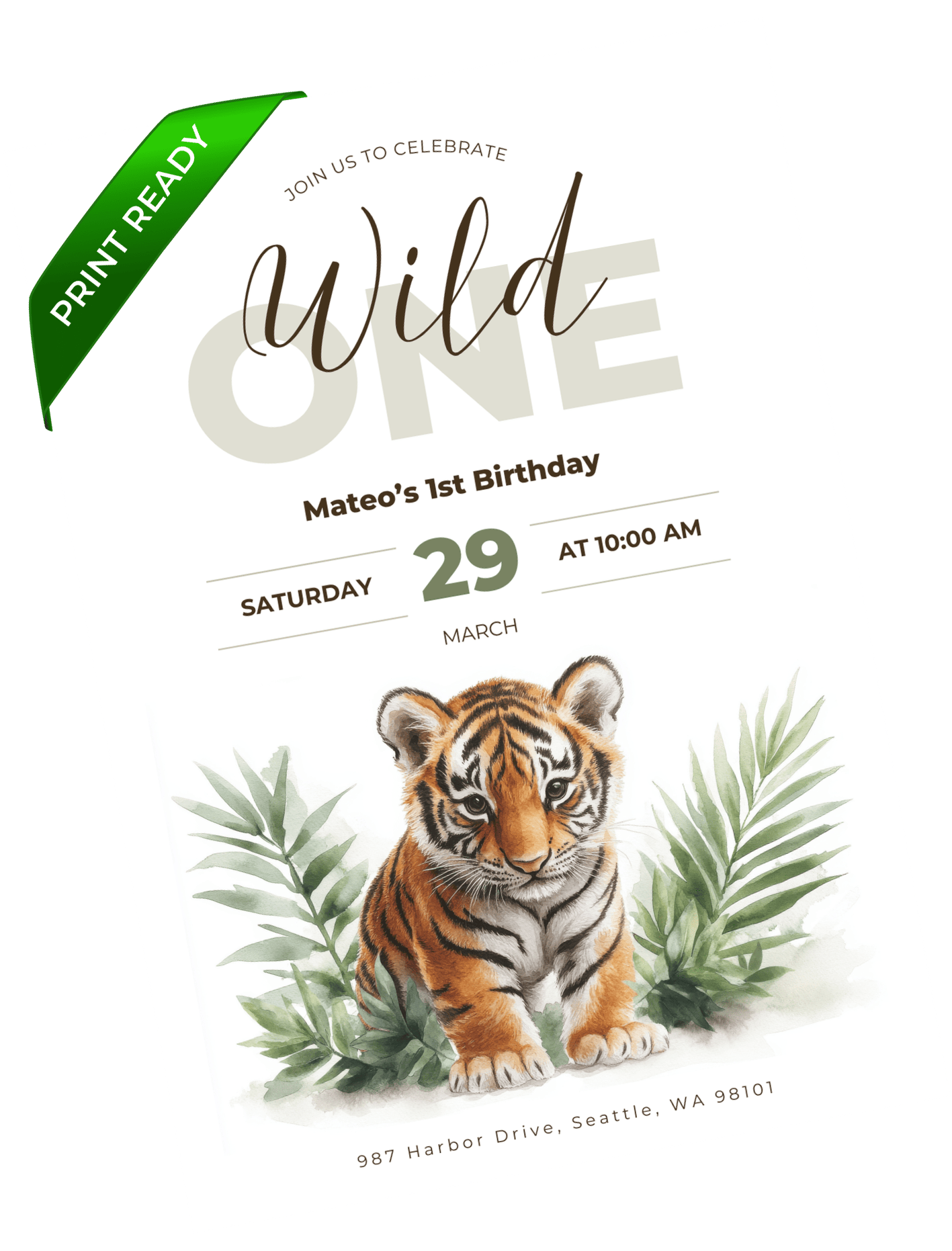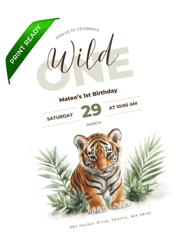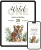 A modern Wild One invitation centered around a confident illustrated tiger with greenery and clean typography. A great fit for little ones who love bold animal themes. Easily customize in Canva and send a stylish, nature-inspired invite.