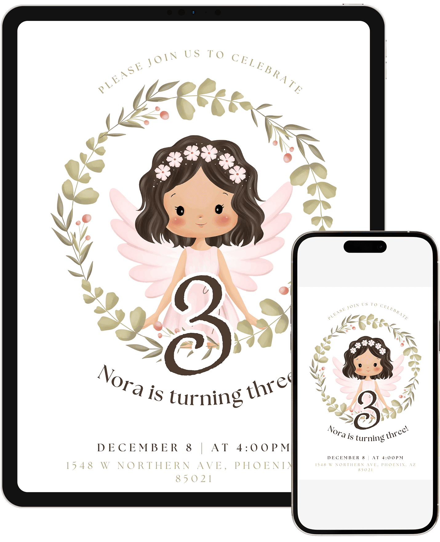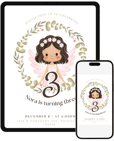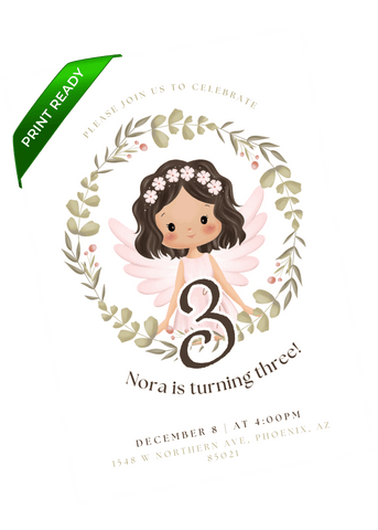 A soft, whimsical fairy invitation with pastel greenery and a gentle illustrated fairy. Ideal for a child who loves magical themes, fairies, and imaginative play. Customize in Canva to create a bright digital or printable birthday invite.